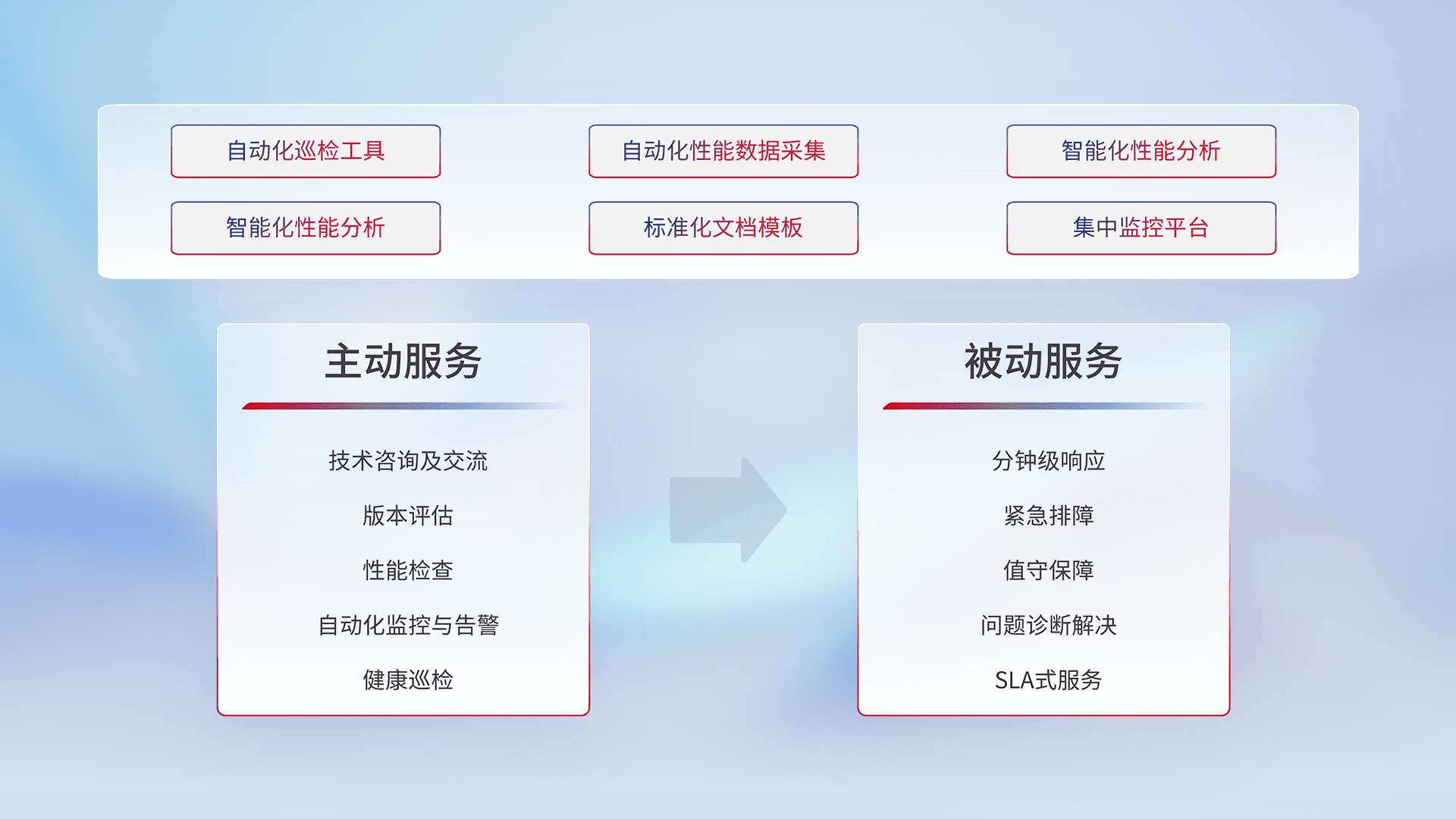 智能化工具和标准化文档,,保障服务质量,,提供主动服务(包含技术咨询、、、、版本评估、、、性能检查、、、、自动化监控与告警、、、健康巡检)和被动服务包含(分钟级响应、、、紧急排障、、值守保障、、问题诊断解决、、、SLA服务)。。。。
